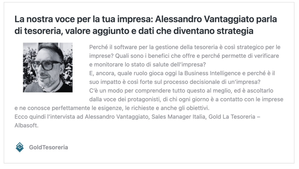 Si tratta di un valore aggiunto, perché da essa nascono dati che permettono di migliorare e potenziare il processo decisionale. Scopri come farlo e quali strumenti tecnologici adottare nell’intervista ad Alessandro Vantaggiato, Sales Manager Italia Gold La Tesoreria.